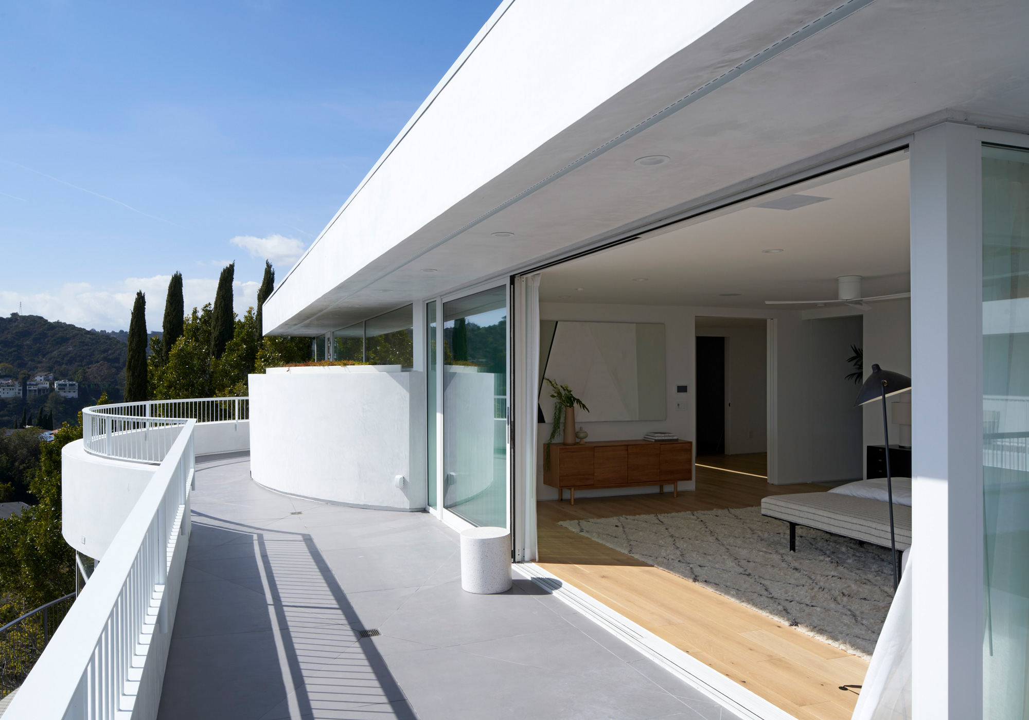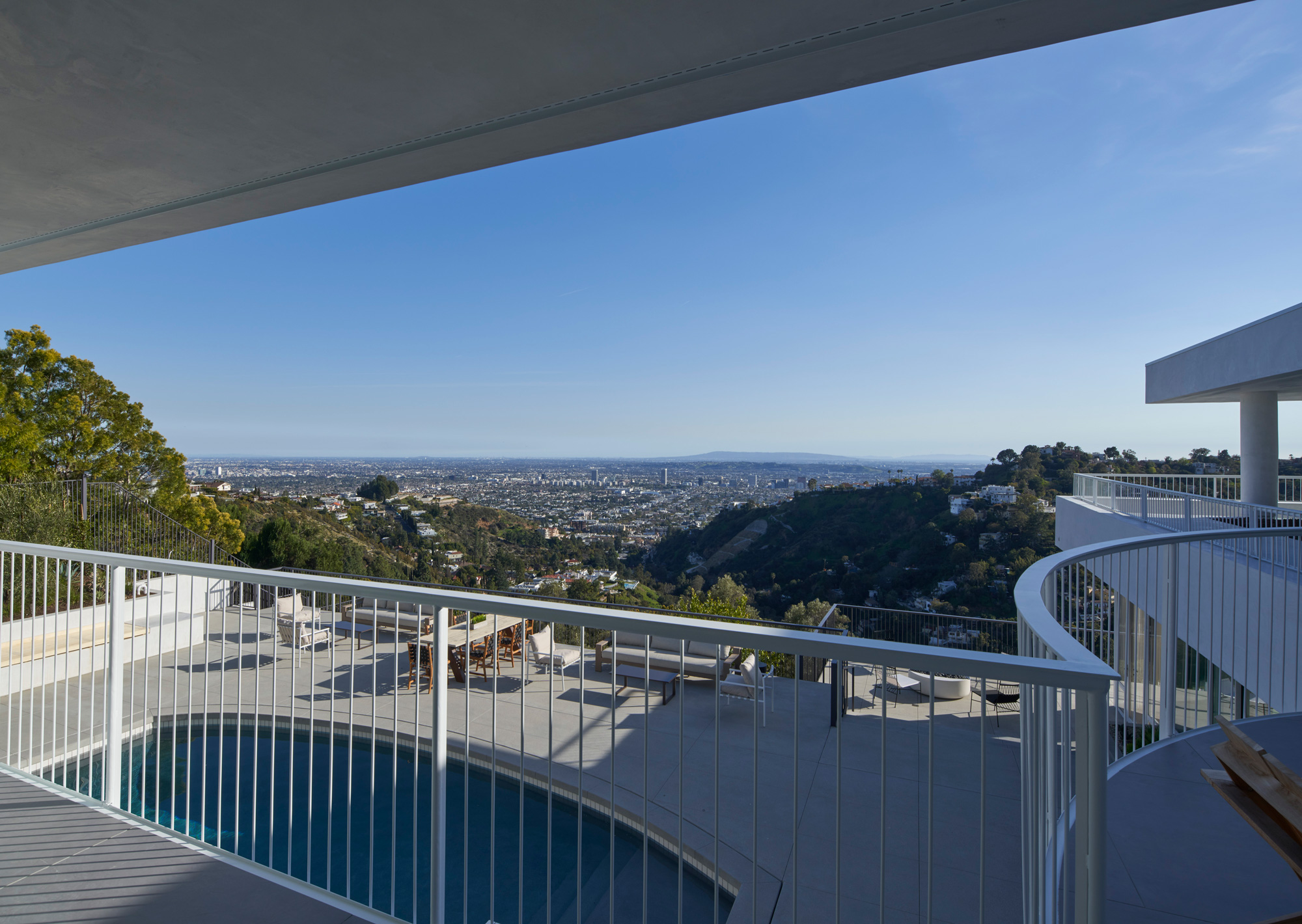 Architect Pierre De Angelis of Good Project Company has enhanced the building’s geometry and reinforced the connections between inside and outside to create an imposing and generous work of architecture in the great modernist tradition. The landscape architecture is by sought after designer Michael Fiore and is characterized by its clean, minimal design and native plantings that work in seamless harmony with the pared-back architecture and the context of the gently rolling Hollywood Hills.