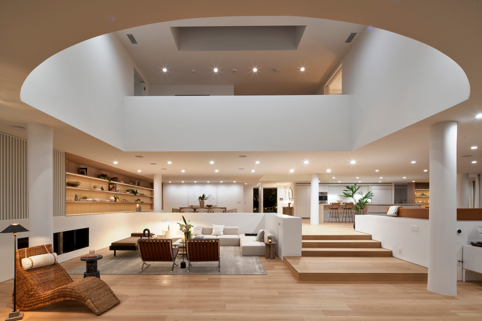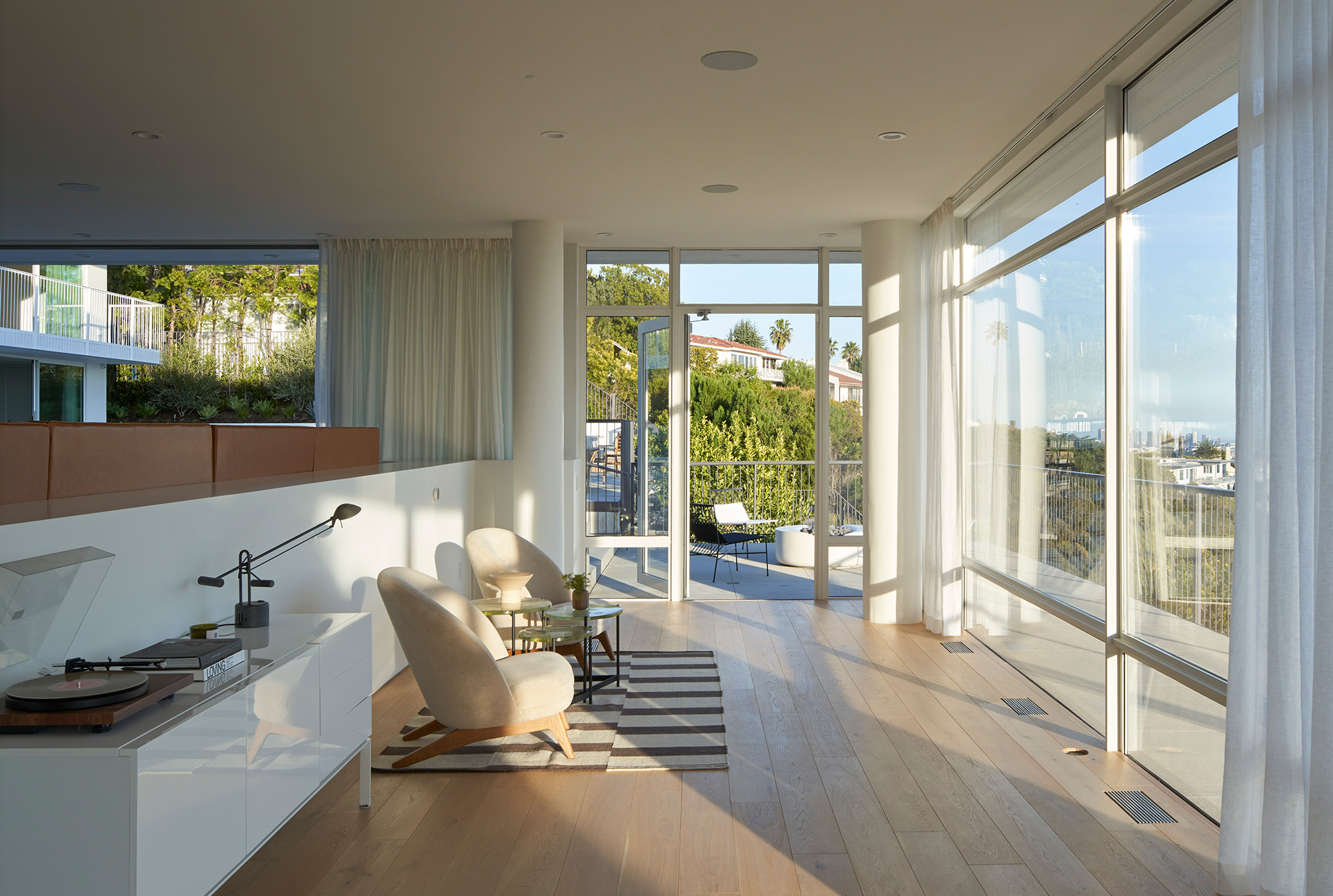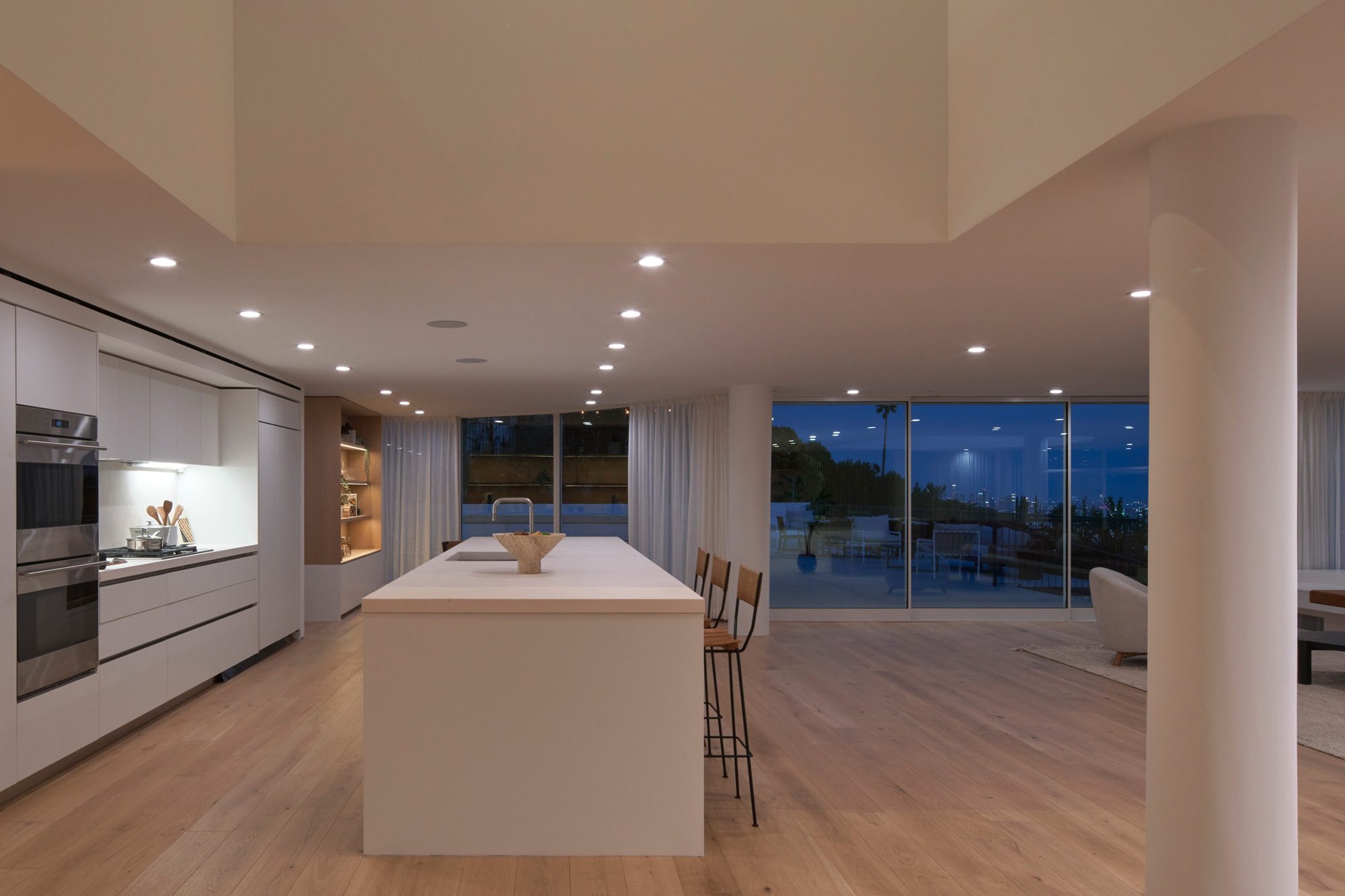 Architect Pierre De Angelis of Good Project Company has enhanced the building’s geometry and reinforced the connections between inside and outside to create an imposing and generous work of architecture in the great modernist tradition. The landscape architecture is by sought after designer Michael Fiore and is characterized by its clean, minimal design and native plantings that work in seamless harmony with the pared-back architecture and the context of the gently rolling Hollywood Hills.