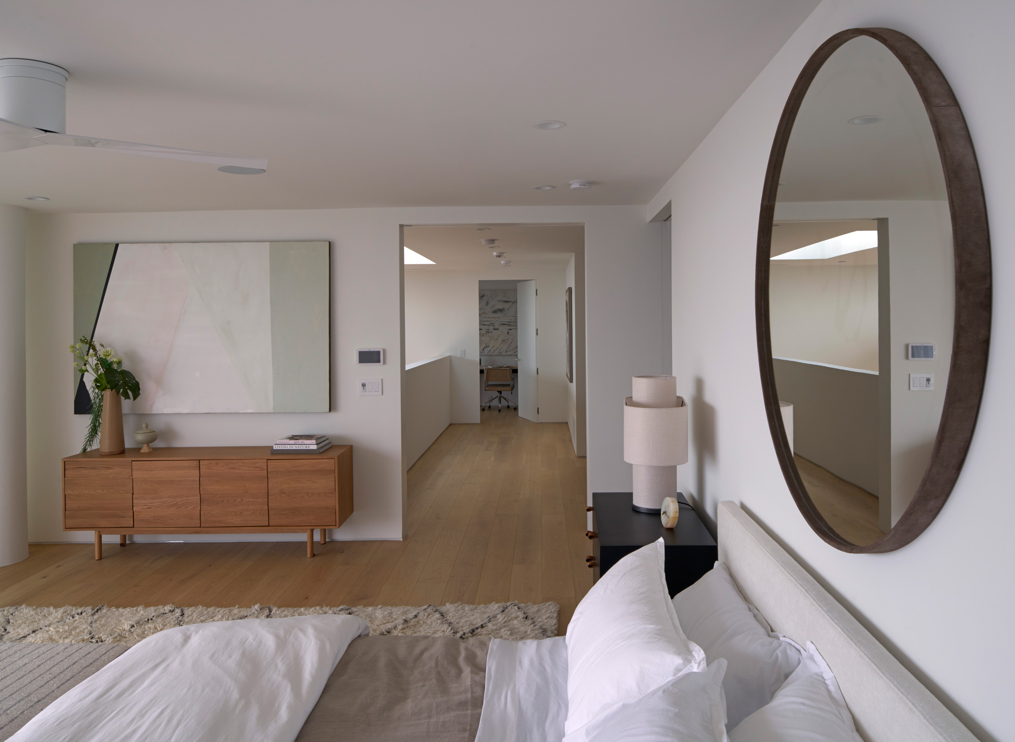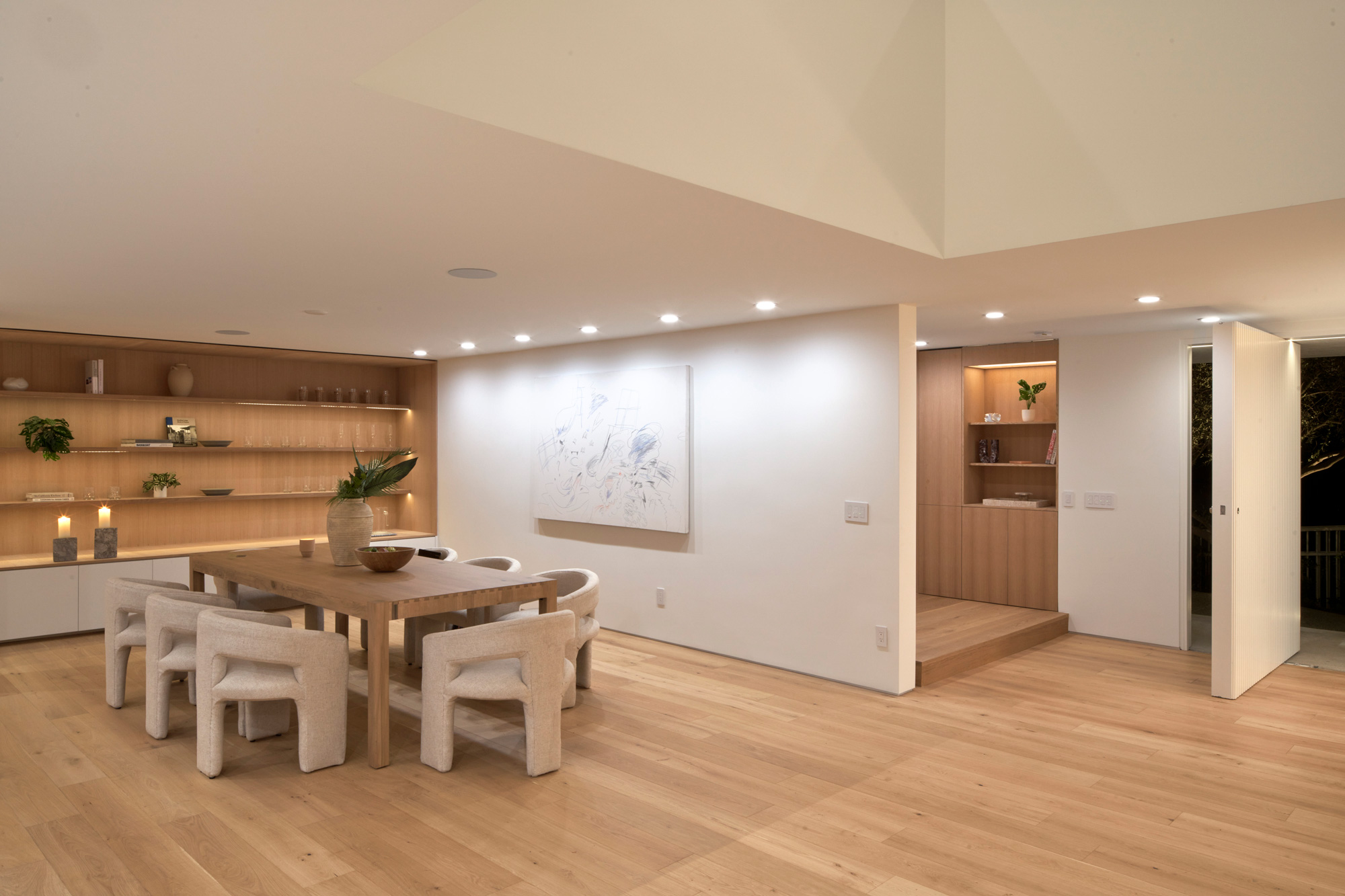 The kitchen and living spaces are accentuated by honed Italian Paloma limestone which forms the counters of the custom Abitar Projects kitchen with its matte polar white cabinetry and concealed appliances. Paloma limestone also forms the minimal hearth in front the living space’s flush-fitting black steel fireplace. Thoughtful touches abound such as the concealed 85” TV which is hidden within the custom white oak bookcases and can be raised at the touch of a button. Adjacent to the kitchen is a large banquette seating area, custom-designed and upholstered in dark orange leather. Flooring is wide-plank European white oak throughout.