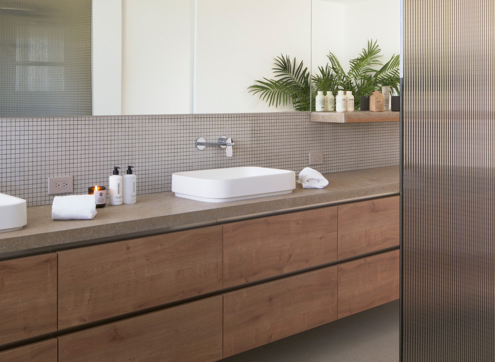Bathroom suites are outfitted with carefully chosen materials to compliment the architectural design - this is nowhere more evident than in the primary bathroom where brushed French Saint Beauzire limestone works beautifully with the fluted glass screen, Japanese architectural tiles, Graff faucets and Aquatica vanities.